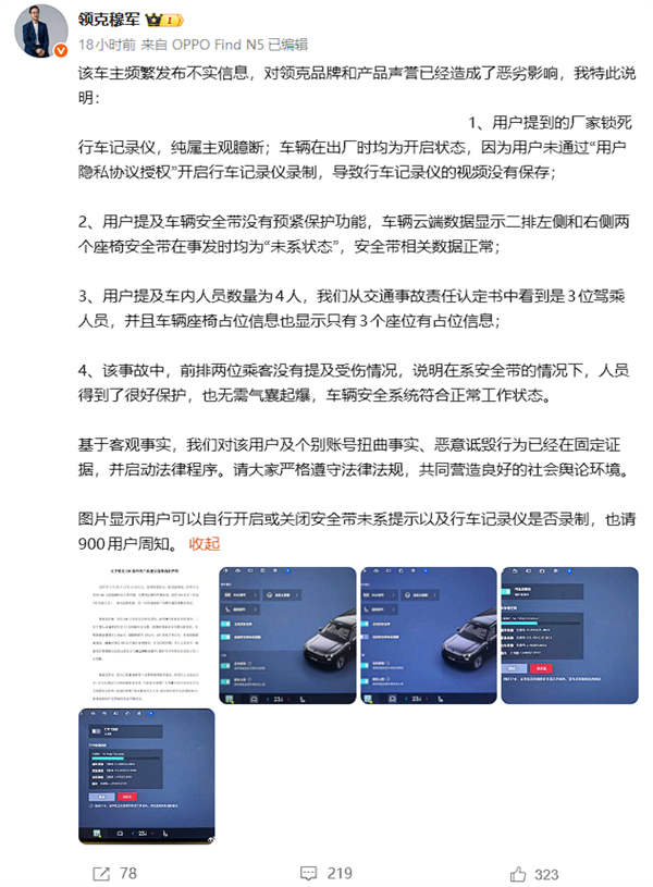 随后,领克汽车销售有限公司副总经理穆军发布微博称:该车主频繁发布不实信息,对领克品牌和产品声誉已经造成了恶劣影响。